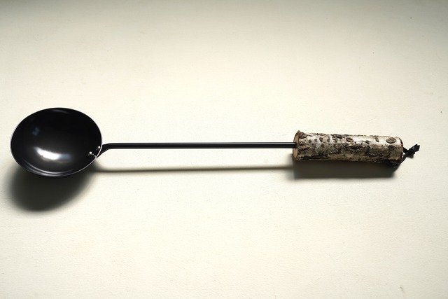持ち手部分にナラ(ジャパニーズオーク)の天然木を使用したロウリュ用ラドル。自然の楢の小径木を使用しているので二つと同じ形状はありません。 小径木の材木は一般に流通していません。自ら山に入り、伐採から自分で行っています 水を吸い上げていない冬の時期に伐採をし、ヒビが入らないよう日陰でゆっくり乾燥しています。商品化までに15か月以上の乾燥期間を置いています 紐部分は本革ヒモです 全長440mm~470mm個体差があります。 本体:鉄 柄:木(ナラ) 木の皮がめくれてきますが天然木の風合いをお楽しみください 作成時に付いたスレなどがある場合がございます
